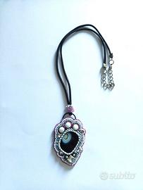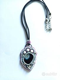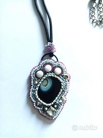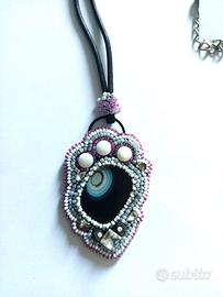 ciondolo eseguito con tessitura a mano di perline intorno ad una pietra centrale di agata fumè striatura naturale, cordino in cotone nero