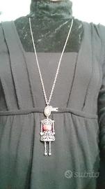 ciondolo a forma di bambola, lavorazione a filigrana davanti e dietro. Quattro grandi cristalli Swarovski e pietra opale per la testa. In metallo color argento. Possibilità di spedizione.