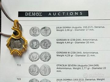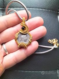 Elegante ciondolo realizzato con una vera moneta romana in argento, incastonata in una montatura in filo di ottone
