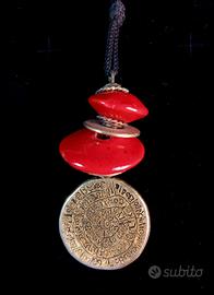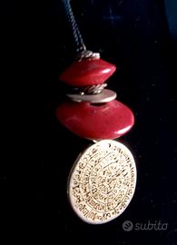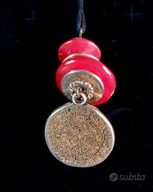 Ciondolo di ispirazione Maja con la riproduzione del calendario Maja dorato ed elementi rossi e dorati in metallo e ceramica. Prezzo trattabile