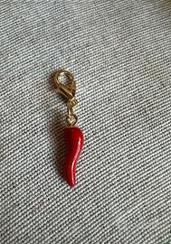 Ciondolo cornetto rosso con gancio. Placcato oro e smaltato a mano. Molto comodo per poterlo attaccare a chiavi,collane,braccialetti ecc…