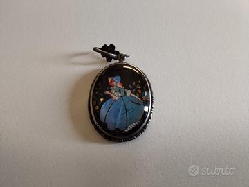 ciondolo in argento sterling di forma ovale, lungo ca. cm. 4, con ala di farfalla Morpho protetta da un coperchio di vetro dipinto al contrario. La pittura, in miniatura, raffigura una giovane donna ritratta circondata da elementi floreali. La fanciulla ha i capelli rossi e indossa un abito d'epoca azzurro iridescente, con cappello in tinta (abito e cappello creati dall' ala di farfalla) e scarpe rosse. Incisa sul retro del ciondolo la marcatura "Sterling Silver England PAT. 202213" indicante il materiale (argento sterling), la provenienza (Inghilterra) e il numero di brevetto, che nello specifico identifica un brevetto britannico depositato dalla Shipton & Co. di Birmingham il 16 agosto 1923 riguardante la tecnica del dipinto inverso su vetro utilizzando ali iridescenti di farfalla Morpho blu posizionate sotto vetro. Parte con il dipinto in condizioni perfette; qualche segno di usura sul retro No spedizione. Solo vendita diretta in loco