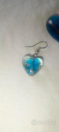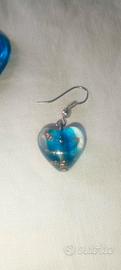 Ciondolo a forma di cuore in vetro soffiato per la creazione di gioielli, azzurro con polvere di stelle dorata. con relativi coppia di orecchini