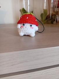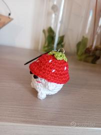 Simpatico e delizioso Funghetto con cappello di Fragola eseguito alluncinetto in cotone. Bianco e rosso. Laccetto per appenderlo lungo cm 6
