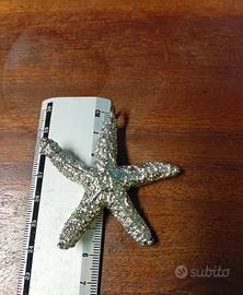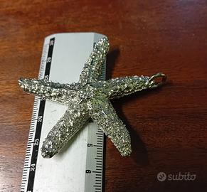 Grande ciondolo molto luminoso a forma di stella marina nuovo.Comprato in gioielleria,mi è stato venduto per argento ma senza timbro.Superficie lavorata effetto vera stella marina.NON rispondo del materiale, si applica la formula "visto e piaciuto".Misure nelle immagini.Sacchettino di organza in omaggio.