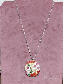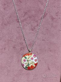 Scopri l'eleganza senza tempo di questo ciondolo artigianale, realizzato con pregiato cotone broccato giapponese. Il tessuto, noto per la sua qualità e bellezza, presenta un motivo floreale tradizionale arricchito da dettagli dorati che catturano la luce in modo affascinante. Il cabochon, di 38 mm, è montato su una collana color argento lunga 50 cm, creando un equilibrio perfetto tra tradizione e modernità. Questo pezzo unico è ideale per chi desidera aggiungere un tocco di raffinatezza al proprio stile quotidiano o per chi cerca un regalo speciale che racconti una storia di artigianato e cultura.
