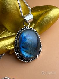 Elegante e ricco di fascino, questo ciondolo presenta una splendida labradorite naturale dalle intense sfumature blu e verdi, incastonata in una montatura in stile vintage placcata in argento 925. Il cabochon ovale esalta i giochi di luce tipici di questa pietra, donando al gioiello un effetto magico e cangiante.