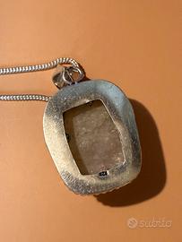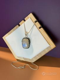 Lasciati incantare dalla magia di questo elegante ciondolo realizzato in pietra di luna naturale, incastonata in una raffinata montatura in argento 925 placcato, dal design artigianale e ricco di dettagli. La pietra, con i suoi riflessi cangianti che virano tra il blu e il madreperlato, è simbolo di intuizione, femminilità e protezione interiore.