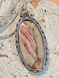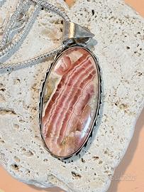 Ciondolo in Rodocrosite naturale – Energia del cuore 💗 Delicato ed elegante ciondolo in rodocrosite naturale, caratterizzato da splendide venature rosa che creano disegni unici e irripetibili. ✨ Montatura placcata argento 925 📿 Catena inclusa 🌿 Pietra naturale – pezzo unico 🔮 Il retro aperto permette alla pietra di restare a contatto diretto con la pelle, favorendo una connessione più intensa con la sua energia. La rodocrosite è conosciuta come la pietra del cuore e dell’amore verso sé stessi: aiuta a sciogliere blocchi emotivi e a ritrovare dolcezza e armonia. ⸻ 📏 Misure: • Ciondolo: circa 4 x 2 cm (con gancio) • Spessore: circa 0,5 – 0,7 cm • Catena: circa 45 cm