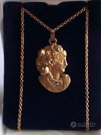 eccezionale ciondolo anni 40 raffigurante il viso di una dama dell'800 finemente lavorato a sbalzo da notare la collana di perle al collo ed un brillantino taglio antico e le tre rose nei capelli in oro 12 kt peso gr. 7,2 misura cm. 1,7 x 3,3 la catenina è in oro 14 Kt. lunga cm. 46,5 peso gr. 3 originale dell'epoca il tutto mai indossato il gioiello delle nostre nonne possibiiltà di consegna a mano per residenti di Napoli e provincia per altre destinazioni spedizione postale tracciata previo bonifico bancario anticipato prezzo NON TRATTABILE