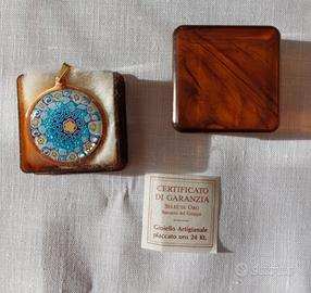 Vendo bellissimo ciondolo artigianale con disegni floreali placato oro 24 kt con decorazioni su entrambi i lati. Comprensivo di certificato (vedi foto pubblicate) Marca : Selecta oro - Bassano del Grappa. Grandezza del ciondolo 3 cm. Completamente nuovo e mai utilizzato, ancora nella sua confezione originale.