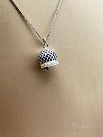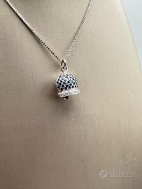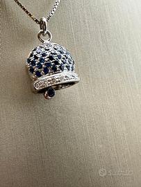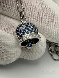 Proponiamo un elegante ciondolo campanellino con catena in oro bianco 18 kt, caratterizzato da un design raffinato e scenografico, impreziosito da zaffiri blu naturali e diamanti. Un gioiello luminoso e originale, ideale come regalo importante o come scelta personale di grande stile.