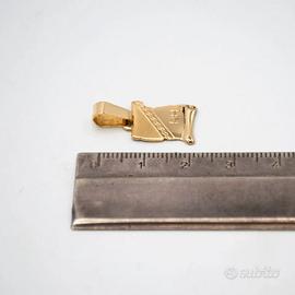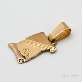 Ciondolo in oro giallo 18 kt grammi 1,9 del gruppo RH a forma di pergamena. La lavorazione è satinata e lucida ed è possibile fare un’ incisione su richiesta. Il ciondolo misura cm. 2,4 compreso l’ anellino per cm. 1,2. Prodotto made in Italy munito di marchio di fabbrica come da legge e completo di confezione e certificato di qualità rilasciato dalla Gioielleria.