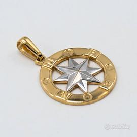 Ciondolo in oro giallo e bianco 18 kt grammi 2,7 raffigurante la “Rosa dei venti”. La lavorazione è lucida e misura cm. 3,1 compreso l’ anellino. Prodotto made in Italy munito di marchio di fabbrica come da legge e completo di confezione e certificato di qualità rilasciato dalla Gioielleria.