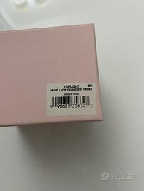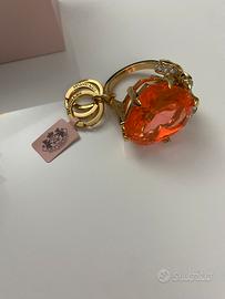 Portachiavi originale Juicy Couture con maxi ciondolo a forma di cuore arancione sfaccettato. Dettagli dorati con strass e logo del brand. Inclusa scatola originale rosa con interno in velluto nero.