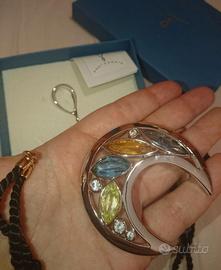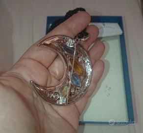 Marca Pierre Lang. Ciondolo - Spilla Luna, placcato rodio con grandi zirconie (no zirconi) multicolore colorate e luminose. Ha un cordino nero per essere indossato come collana oppure può essere indossata come spilla. Ha anche un doppio gancio. Nuovo, mai indossato. Rimane inalterato nel tempo. Si può lavare con acqua e sapone.