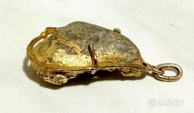 Montatura a cestello, interamente creata artigianalmente con metallo dorato e sormontata da un anellino per inserirlo facilmente in una catenina. Misura lunghezza massima mm. 40 e larghezza massima mm.32.