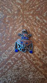 Ciondolo tribale. Rappresenta una figura stilizzata di tipo tribale o precolombiano. Si tratta di metallo argentato con decorazioni smaltate in blu e rosso. Volto geometrico, con anello al naso e corona o copricapo caratteristico. Forse legato all’arte peruviana, o alla cultura Inca. Souvenir etnico in ottime condizioni, risalente agli anni ’70-’90. Misure: 3x3 cm. Prezzo trattabile