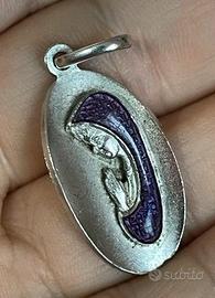 Raffigura la Madonna in preghiera con dettaglio smaltato color viola, molto elegante e particolare. Lavorazione in rilievo con fondo satinato e parte centrale lucida.
