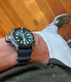 Descrizione Orologio diver da uomo Citizen collezione Promaster Aqualand I Diver ref. JP2007-17X Edizione Limitata. Cassa in acciaio con finitura IP grey da 44 mm. Quadrante verde con display analogico-digitale. Lancetta dei secondi, indici e sfere ad alta luminosità. Ghiera girevole unidirezionale. Movimento al quarzo con sensore di profondità. Cinturino in poliuretano nero, chiusura con fibbia e prolunga diver compresa nella confezione. Fondo e corona serrati a vite. Vetro minerale antiriflesso. Impermeabile fino a 20 bar. Diver`s professionale certificato ISO 6425. Funzioni: calendario completo, suoneria, cronografo con rilevazione tempi parziali, rilevazione dati di immersione e relativa memorizzazione, allarmi di immersione, controllo carica batteria. Sensore di profondità.