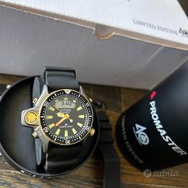 Citizen Promaster Aqualand 40° Anniversario – JP2008-06E - Limited Edition - Nel 1985, Citizen presentò il primo orologio subacqueo al mondo con profondimetro elettronico: il leggendario Aqualand. Per celebrare il suo 40° anniversario, Citizen propone un modello in edizione limitata, il JP2008-06E, un tributo moderno ma fedele al design originale Questa edizione mantiene gli elementi distintivi come la corona a ore 4, i tre pulsanti e il sensore di profondità a ore 9, rimanendo fedele all’estetica storica. Si arricchisce però di eleganti dettagli dorati all’interno di una cassa in acciaio inox grigio opaco con finitura ionica Dotato di funzioni quali orario, calendario, allarme e cronografo, l’orologio offre anche misurazione della profondità, monitoraggio del tempo di immersione, allarme di risalita e lancette luminescenti per garantire visibilità sott’acqua. Il cinturino è realizzato in BENEBiOL, un poliuretano di origine vegetale, mentre il fondello inciso celebra questo importante traguardo Specifiche tecniche: •Movimento: Quarzo, precisione ±20 sec/mese •Funzioni: Ora, calendario, allarme, cronografo (1/100 sec, contatore 100 minuti), profondimetro, modalità immersione, allarme di risalita •Cassa: Acciaio inox grigio con trattamento ionico, 50 mm •Cinturino: Poliuretano nero BENEBiOL con chiusura ad ardiglione •Vetro: Minerale •Impermeabilità: 200 metri •Edizione limitata: 5.800 esemplari in tutto il mondo •Confezione speciale: box celebrativo con mini bombola sub commemorativa •Garanzia: 5 anni (valida in tutto il mondo, con registrazione digitale presso Citizen Service Center) Informazioni aggiuntive: •Inclusa ricevuta d’acquisto originale da Rivenditore Autorizzato Citizen (fine agosto 2025) •Garanzia internazionale Citizen valida fino al 26 agosto 2030, registrata digitalmente e riconosciuta a livello mondiale x 5 anni •Spedizione nazionale esclusivamente tramite corrieri espressi (UPS o Bartolini) •Per ulteriori informazioni contattatemi direttamente