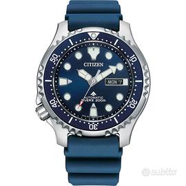 itizen Orologio uomo Promaster Marine automatico * Questo orologio è dotato di un meccanismo automatico (si ricarica tramite ogni movimento con il polso; non richiede batteria). Questo orologio analogico dispone di una funzione calendario: giorno – data, lancette luminose, numeri luminosi * Questo orologio di alta qualità ha un cinturino in gomma blu (lunghezza 21 cm e larghezza 19 mm) con una fibbia ad ardiglione * Diametro della cassa: 41 mm, altezza della cassa: 12 mm, colore della cassa: argento, colore quadrante: blu * Impermeabile: 20 bar, peso: 149 g * L'orologio viene fornito in una bella confezione a forma di bombola per immersione e doppio cinturino come in foto. PERMUTO ALLA PARI CON IPHONE 16