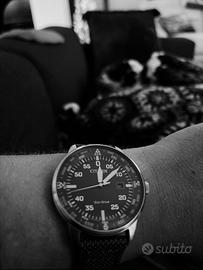Orologio Citizen Aviator Eco Drive Modello Con Cassa In Acciaio Con Fondo Serrato A Vite Del Diametro Di 42Mm, Quadrante nero Vetro Minerale E Cinutrino In Tessuto Tecnico Verde Militare. Orologio Solo Tempo Con Movimento Eco Drive Con Riserva Di Carica Di 180 Giorni, Datario E Resistenza All'Acqua Di 10 Atm. Casio g-schock titanium seiko crono vagary suunto tissot festina pilot sector locman smart watch samsung apple android amazon active neo promaster