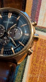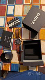 Orologio Citizen 43-46 mm perfettamente funzionante. Cinturino in pelle marrone con segni di usura (come da foto) Funzione cronografo (fino a 60 minuti). Calendario: giorno del mese (quindi a Marzo, Maggio, Luglio, Ottobre e Dicembre occorre regolare la data) Batteria al litio ricaricabile con la luce solare (o lampade fluorescenti) Impermeabile fino a 10 atmosfere. Manuale di istruzione (in Italiano, inglese, francese, spagnolo , portoghese , cinese). Nella sua scatola originale. Prodotto originale fuori garanzia