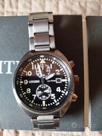Vendo da personale collezione bellissimo Citizen crono ecodrive , referenza CA7040-86E, acciaio brunito colore antracite, vetro minerale, water resistant 100 metri, doppia chiusura deplorante, diametro cassa 41 millimetri, funzionamento alimentato dalla luce, riserva di carica 12 mesi. Fondello ancora pellicolato. Euro 169. Visibile in Torino, posso spedire. No a scambi, permute, offerte improponibili e perditempo, grazie