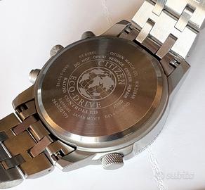 Citizen Crono Pilot Acciaio CB5860-86E - come NUOVO Ricevuto in regalo a dicembre 2022 Prodotto a Giugno 2022 (come da codice inciso sul fondello) Usato davvero molto poco. Nessun segno di usura. Con scatola ORIGINALE Movimento Eco-Drive a carica solare. Con riserva di carica di 10 mesi. Con indicatore di carica: mai sceso a 3/4 di carica, è sempre stato a 4/4 di carica. L’accumulatore è perfetto. Radio-Controllato a 5 canali. Ricezione automatica del segnale orario: (USA, Europa, Cina, Giappone) World timer con orario di 24 città del mondo e ora UTC. Allarme/Sveglia + Cronografo Cassa e cinturino in acciaio. Vetro zaffiro WR 20 Bar Diametro cassa 45 mm Ghiera girevole bidirezionale con sistema regolo calcolatore (tramite corona a ore 8)