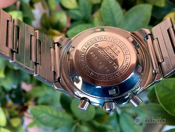Citizen referenza SSB 4-900014 Chronograph JDM del 1972.La cassa mai lucidata Misura 38 mm. di larghezza ad esclusione di tasti e corona, 45 lug to lug per 13 di spessore,dial blue e sfere originali,fondello a vite ,corona doppio scatto ok,datario inglese e kanji perfettamente funzionante,Movimento meccanico a carica automatica di manifattura Citizen cal.8100 con ruota a colonne con funzione flyback perfettamente funzionante con buona tenuta del tempo e riserva di carica,non possiedo scatola e garanzia.