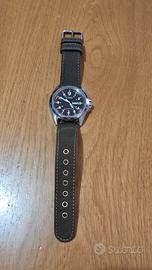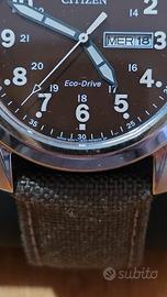 Citizen Eco-Drive AW0050-40W – Field Watch 43 mm – Full Set – Eccellenti condizioni Propongo in vendita Citizen Eco-Drive modello AW0050-40W, un orologio dallo stile field/militare, robusto, affidabile e perfetto sia per uso quotidiano che per collezione. L’orologio è dotato di tecnologia Citizen Eco-Drive: funziona a luce (solare e artificiale) e non necessita di sostituzione batteria. Una volta carico, ha un’autonomia di diversi mesi anche al buio. Questo significa manutenzione minima e massima affidabilità nel tempo. Caratteristiche principali: Movimento Citizen Eco-Drive calibro J800 Cassa in acciaio da 43 mm Vetro minerale Impermeabilità 100 metri (10 bar) Funzione giorno e data Quadrante nero con numeri arabi e scala 24 ore interna Lancette e indici con materiale luminescente per visibilità notturna Cinturino in tessuto stile militare molto resistente e confortevole Fondello con incisione Citizen Eco-Drive Orologio completo di scatola originale, manuali e garanzia L’orologio si presenta in ottime condizioni estetiche e perfettamente funzionante. Mai aperto, mai modificato, tutto originale Citizen. Questo modello è molto apprezzato perché unisce l’estetica dei field watch militari alla praticità della tecnologia Eco-Drive, risultando un orologio estremamente pratico: lo indossi e funziona sempre, senza pensieri. Ideale per chi cerca un orologio affidabile, leggibile, robusto e con un marchio storico come Citizen, leader mondiale nella tecnologia solare applicata all’orologeria. Spedizione accurata e imballo protetto. Venditore serio, disponibile per qualsiasi informazione aggiuntiva o foto. Per i pagamenti : spedisco solo dopo che l oggetto è stato pagato altrimenti scambio a mano