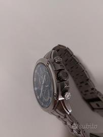 Resistente all'acqua, movimento a energia solare (non richiede cambio batteria, cronografo, datario, e cassa e bracciale in acciaio inox. Quadrante blu.