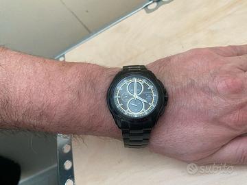 Vendo cronografo Citizen Watch Co. Eco-Drive total black, originale e perfettamente funzionante. È uno di quegli orologi che si apprezzano davvero con il tempo: solido, ben costruito, affidabile. Non segue mode passeggere, ma punta su equilibrio e sostanza. La linea total black è pulita e coerente, sportiva senza essere eccessiva, elegante senza risultare formale. Un orologio che si può indossare ogni giorno senza stancare. Il punto di forza è la tecnologia Eco-Drive: l’orologio si ricarica con la luce, naturale o artificiale. Non necessita di ricarica manuale né di sostituzione della batteria. Una volta indossato, funziona e basta. È una soluzione pratica e intelligente che, una volta provata, diventa difficile abbandonare. Il cronografo è fluido e preciso, il quadrante è ben leggibile e proporzionato. Al polso ha una presenza importante ma equilibrata, senza risultare ingombrante. Il bracciale in acciaio nero è robusto e regolabile, adatto all’uso quotidiano. L’orologio è stato tenuto in collezione per un periodo ed è sempre stato utilizzato con cura. Presenta normali segni del tempo, coerenti con l’uso, nulla di evidente o fastidioso. Vetro e quadrante sono molto belli. Tutte le funzioni sono perfettamente operative. La vendita è motivata solo dal desiderio di fare spazio ad altro. Preferisco che vada a qualcuno che sappia apprezzarlo davvero, piuttosto che tenerlo fermo. Dotazione completa: – Orologio – Scatola originale Citizen – Manuale – Maglie/pin di ricambio Se ti interessa davvero, scrivimi senza problemi: rispondo volentieri e velocemente.