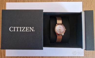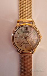 Vendo orologio Citizen Eco-Drive modello EM0892-80D, originale. Movimento Eco-Drive a carica solare, quindi senza batteria. Cassa e bracciale in acciaio color oro, quadrante in madreperla con numeri romani, vetro minerale.