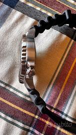 Cassa in acciaio, cinturino in morbido poliuretano. Vetro minerale. Ghiera girevole unidirezionale. Indici e sfere ad alta luminosità. Fondo e corona serrati a vite. WR 20 bar.