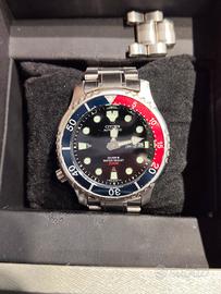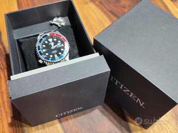 Bellissimo Orologio da collezione Diver's automatico "Citizen Promaster NY00-40" con movimento Miyota, riserva di carica 42 ore, elegante e sportivo allo stesso tempo, appena sostituta la lunetta di tipo superiore (come il successivo NY-0085), e il Cinturino. Cedesi a questo prezzo modico per mancanza della lancetta dei secondi durante la revisione dell'orologiaio ma sostituibile in qualsiasi momento. L'orologio è perfettamente garantito al 100% sul funzionamento, presenta semplici graffi naturali di usura. -Materiale Cinturino acciaio -Misura Diametro 42mm -Spessore cassa 12,5mm -Peso 95gr -Materiale acciaio 316L Iso 200m -Scatola originale €.130.