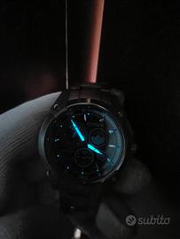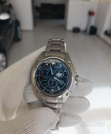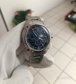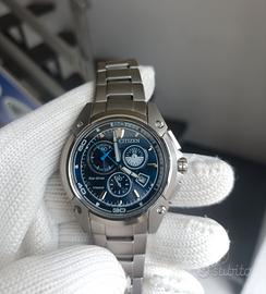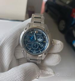 Citizen Super Titanium Chrono Movimento eco-drive a ricarica di luce infinita. Movimento h-500 brevettato Citizen Cassa in Titanio da 42mm Quadrante blu Full Luminor notturno Datario Bracciale originale in Titanio molto largo Perfettamente funzionante Reparto Chrono preciso all impulso Condizioni estetiche Eccellenti (piccoli hairline visibili solo su piccola lunetta lucida ma facilmente rimovibili con lucidata) Originale e coevo Peso di soli 100gr ! Si rende visibile e disponibile da Esclusiva Collezione Personale. Astenersi perditempo ....guarda il mio armadio!