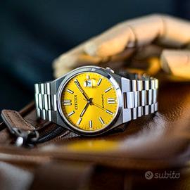 Citizen Tsuyosa colore quadrante giallo referenza NJ0150 - 81Z con movimento miyota calibro 8210 Orologio automatico Resistenza all'acqua: 50M, Funzioni data con lente magnificatrice Vetro Zaffiro Cinturino Materiale in acciaio con fondello a vite Misurare: 40.00 mm Materiale: In acciaio inox Vetro Zaffiro Movimento automatico calibro 8210 (40 ore di riserva di carica) senza scatola ma perfetto come si vede in foto , pochi mesi di vita