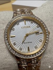 Citizen xC "Daichi" EE1007-67W - Radio Controllato Eco-Drive - Titanio Sakura Pink Descrizione Dettagliata Questo non è un semplice orologio al quarzo, ma un concentrato di tecnologia di precisione giapponese e materiali di lusso: • Modello: Citizen xC (Cross-Sea) EE1007-67W (Serie Daichi). • Materiale Super Titanio™: Cassa e bracciale sono in titanio con trattamento Duratect, che lo rende 5 volte più resistente dell'acciaio e incredibilmente leggero. Il colore è l'esclusivo "Sakura Pink" (oro rosa delicato tipico di Citizen). • Movimento Calibro H296: • Eco-Drive: Si carica con la luce. • Radiocontrollato: Si sincronizza automaticamente con i segnali orari atomici per una precisione assoluta. • World Time: Gestione facilitata di diversi fusi orari. • Quadrante: Spettacolare lavorazione con motivo solare, indici impreziositi e la complicazione "Sun and Moon" (indicazione giorno/notte) visibile a ore 6. • Vetro: Zaffiro sferico con rivestimento antiriflesso. • Condizioni e Garanzia: Acquistato il 15 novembre 2023 in Giappone (come da timbro). È praticamente nuovo e coperto dalla garanzia ufficiale.