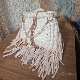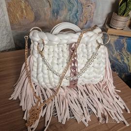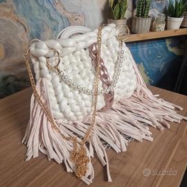 Chanky Bag borsa unica nel suo genere realizzata a mano semilpelle colore bianco perla con frange rosa e accessori di colore oro.