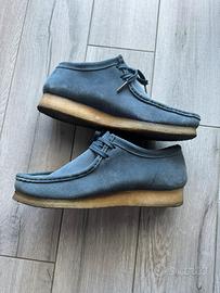 Clarcks wallabe n43 colore blu jeans in tessuto scamosciato, senza difetti, compreso secondo paio di lacci arancione, indossati una decina di volte