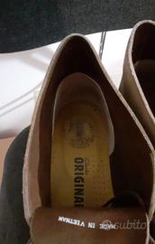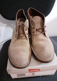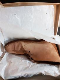 Un’icona senza tempo. Le Clarks Desert Boot Originals nascono negli anni ’50 e diventano subito simbolo di stile per intere generazioni: dai beatnik ai mod, fino alla scena Britpop e ai rude boys giamaicani. Linee pulite, design essenziale e materiali di qualità rendono questo modello ancora oggi immediatamente riconoscibile e intramontabile. Caratteristiche principali: Taglia 42 Tomaia in pelle scamosciata premium “Lupo” Design minimalista e artigianale Chiusura con lacci per una calzata regolabile Fodera in pelle traspirante Iconica suola in crepe naturale Condizioni: Usate poco, in ottime condizioni generali (ben tenute, pronte all’uso) Ideali per: outfit casual e smart casual appassionati di stile classico e senza tempo chi cerca una scarpa iconica e versatile Un vero classico, sempre attuale: qualità, comfort e stile in un’unica scarpa. Materiali (versione breve) Tomaia: pelle scamosciata oliata Fodera: pelle Suola: crepe naturale