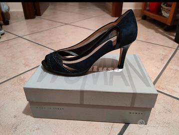 Classico Decolté spuntata Melluso con plateau e tacco a spillo. Fodera in pelle e rivestimento in camoscio, fantasia in rete.