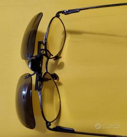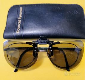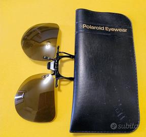 Lenti da sole con clip per applicarle su occhiali da vista. Con custodia morbida. Marca POLAROID modello aviatore a goccia. Misurano 13 x 5 cm circa. Eventualmente regalo gli occhiali delle foto.