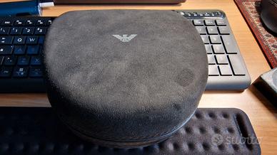 Astuccio vellutato nero per occhiali da vista Emporio Armani con 3 clip-on (2 blu navy con lenti nere e 1 nero lucido con lenti grigie leggermente specchiate), per il modello EA4160.
