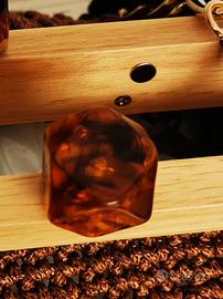 Borsetta fatta a mano di colore marrone caldo, arricchito da scintillanti glitter bronzo, la rende sofisticata e luminosa, perfetta per occasioni speciali o per aggiungere un tocco di classe a un outfit casual. La chiusura clic-clac in legno è un dettaglio che non passa inosservato, conferendo alla borsa una sensazione di solidità e fascino retrò. I pomelli ambra aggiungono un ulteriore tocco di raffinatezza, con la loro tonalità calda che si abbina perfettamente con il marrone della borsa e i glitter. La borsa è anche abbastanza capiente, pur mantenendo una forma compatta, rendendola pratica senza rinunciare allo stile. In sintesi, è un accessorio che spicca per la sua unicità, combinando materiali naturali e decorazioni eleganti, ideale per chi cerca qualcosa di fuori dal comune.