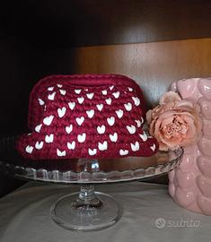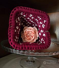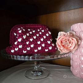 Borsa realizzata a mano in fettuccia morbida bordeaux con dettagli di cuoricini bianchi intrecciati, 21×13