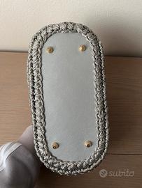 Clutch bag fatta a mano all’uncinetto, realizzata da me in cordino Thai color grigio perla, luminoso e raffinato.