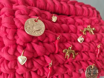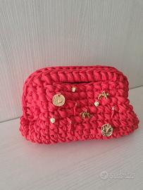 Clutch bag rossa in filato in cotone 100% riciclato realizzato a mano, capienza media (chiusura 20 cm), con charms in metallo